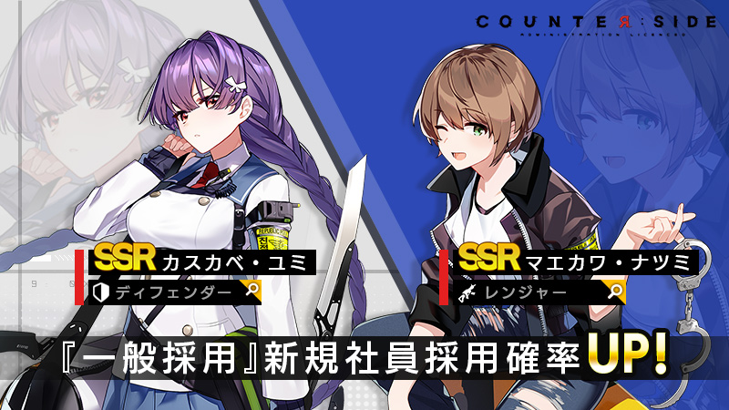 『COUNTER: SIDE(カウンターサイド)』にて、2021年12月22日(水)メンテナンス後より、新ユニット「カスカベ・ユミ」「マエカワ・ナツミ」のピックアップ採用(ガチャ)が開催中です。