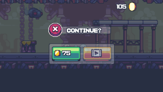 ▲HPが0になり死亡するとゲームは終了。広告を見るか、コインを支払うとその場でコンティニューができます。