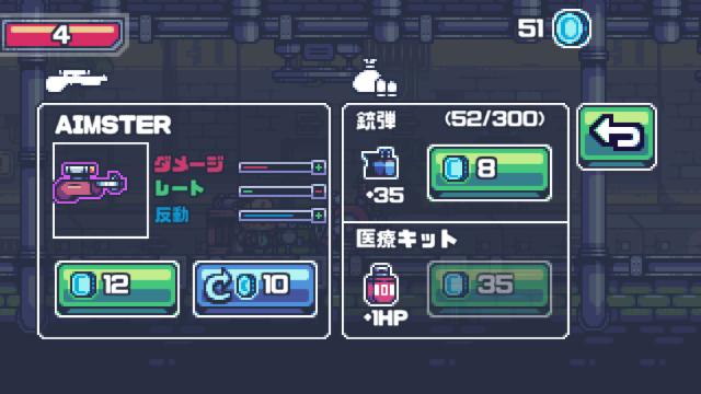 初めから持っている銃の弾は無限ですが、ショップで交換できる銃は強力な代わりに専用の弾を消費します。
