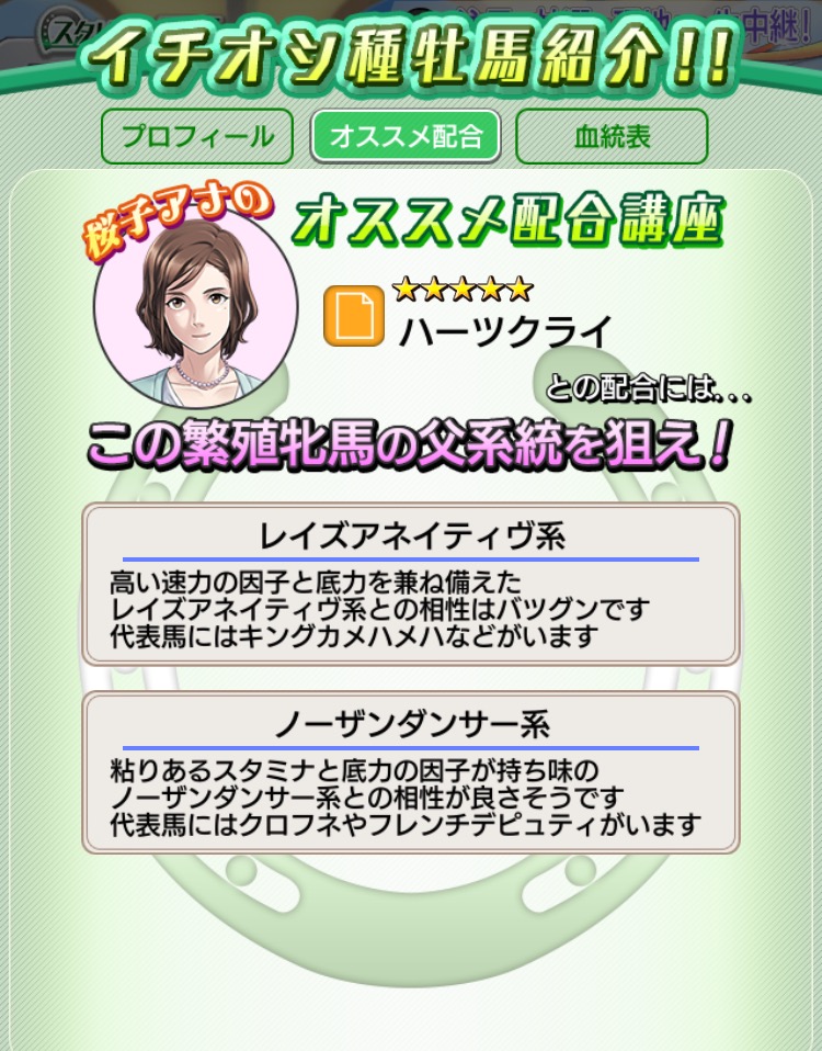 ふむふむ、どうやら狙い通りステイヤーの種牡馬のようです。さらにおすすめの配合も具体的に教えてくれており、まだ耳馴染みのない言葉ばかりの筆者とっては非常に助かります。父系統にレイズアネイティヴ系、ノーザンダンサー系を持つ繁殖牝馬との配合が良いとのことですね。これは覚えておかなくては!