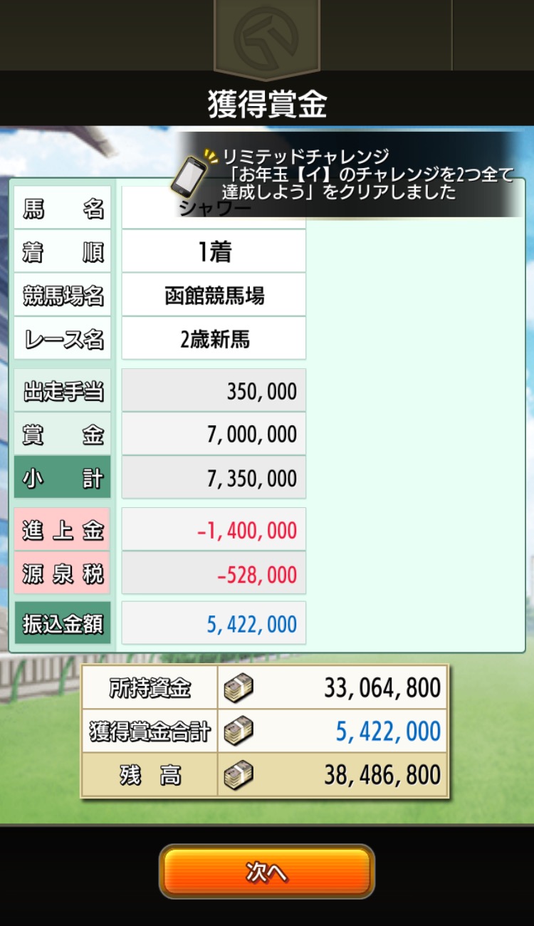 なんと1回のレースでこれだけの報酬を受け取ることができました。やはり名前にお年玉と付くだけあって、かなり大盤振る舞いな報酬なのではないでしょうか。これは残りのチャレンジにも挑戦していきたいところです。
