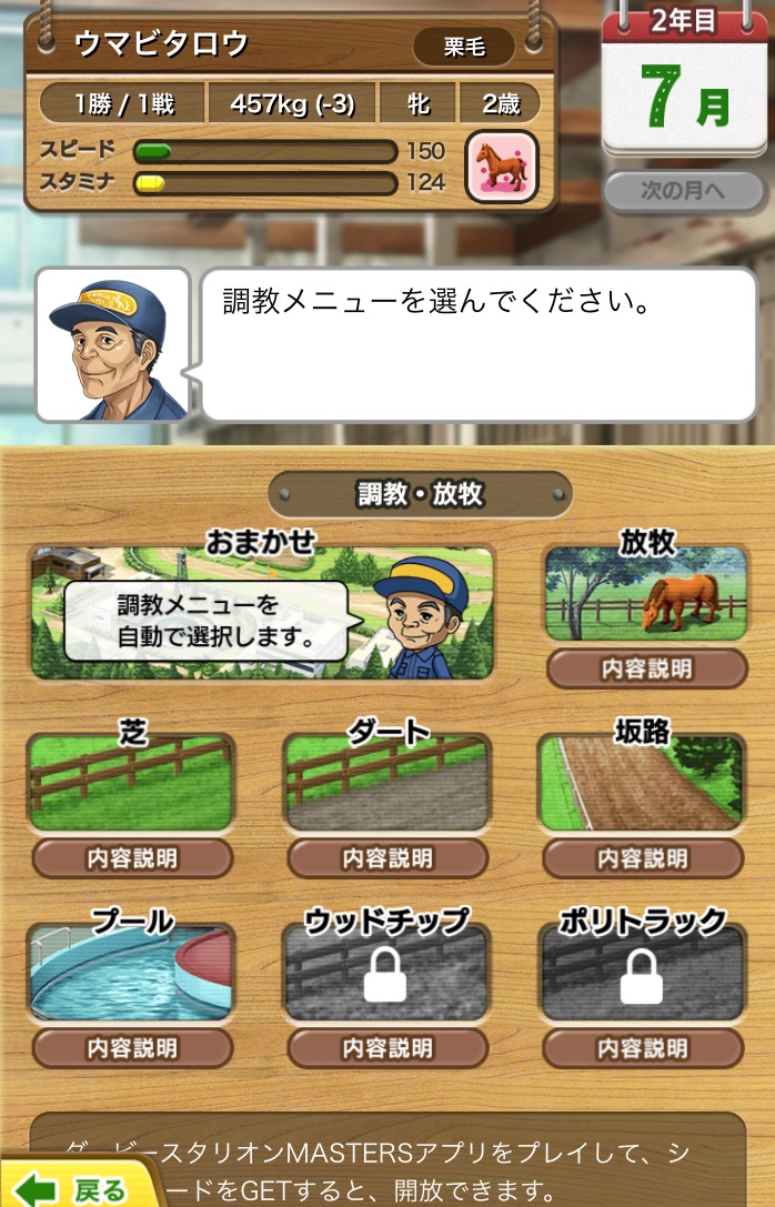 芝、ダート、坂路、プールなど、スピードやスタミナをアップさせる為の調教メニューが選べます。「おまかせ」は自動で調教メニューを選択してくれます。
