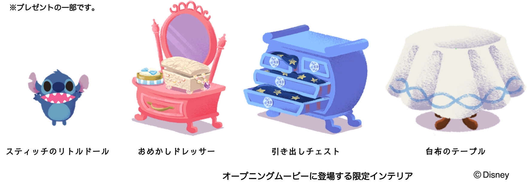 様々なアイテムと交換できるアプリ内通貨から始まり、オープニングムービーに登場する、ここでしかもらえないインテリアの限定アイテム、スティッチのリトルドールなどがプレゼントされます。