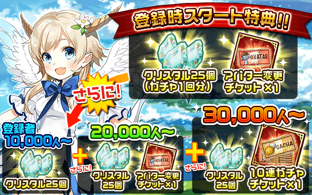 事前登録数の合計に応じて、ガチャが引けるクリスタルやアバター変更チケットなどの豪華特典が、リリース後、全員にプレゼントされます!