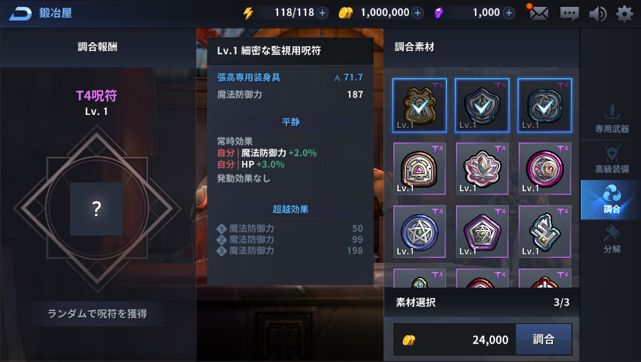 「呪符」「エルストーン(オラ・スター)」のみ組み合わせができ、同じTierの装備3つを消費し、同じTierの装備を1つ獲得できます。