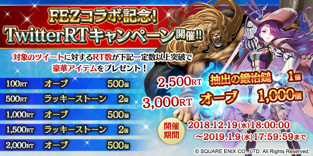 2018年12月19日から2019年1月9日までの22日間、ログインすると1日1回まで500オーブが貰える「FEZコラボログインキャンペーン」が開催中です。