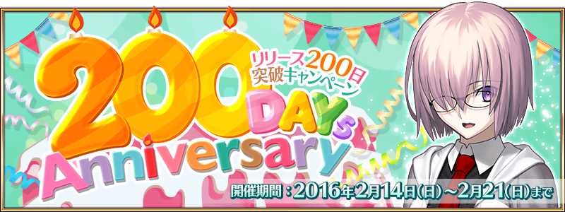 『Fate/Grand Order(FGO)』がリリースされてから、2月14日(日)で200日となりました。これを記念し、「リリース200日突破キャンペーン」が開催!