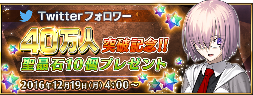 『Fate/Grand Order(FGO)』の公式Twitterフォロワー数が40万人を突破したことを記念して、聖晶石10個がプレゼントされます。