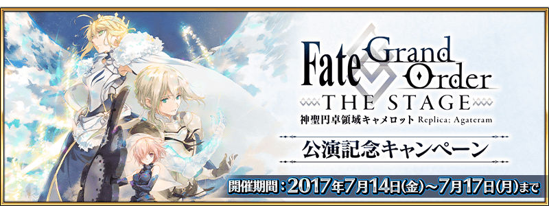 『Fate/Grand Order(FGO)』にて、7月14日(金)より舞台「Fate/Grand Order THE STAGE –神聖円卓領域キャメロット–」の公演を記念して「FGO THE STAGE公演記念キャンペーン」を実施!