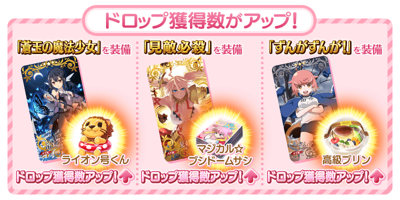期間限定概念礼装を装備することで、イベント専用アイテム「ライオン号くん」「マジカル☆ブシドームサシ」「高級プリン」それぞれの獲得数がアップします。