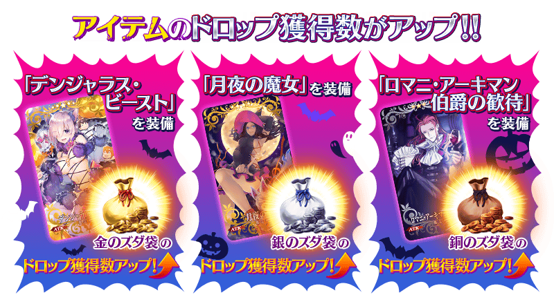 期間限定概念礼装を装備することで、イベント専用アイテム「金のズダ袋」「銀のズダ袋」「銅のズダ袋」それぞれの獲得数がアップします。