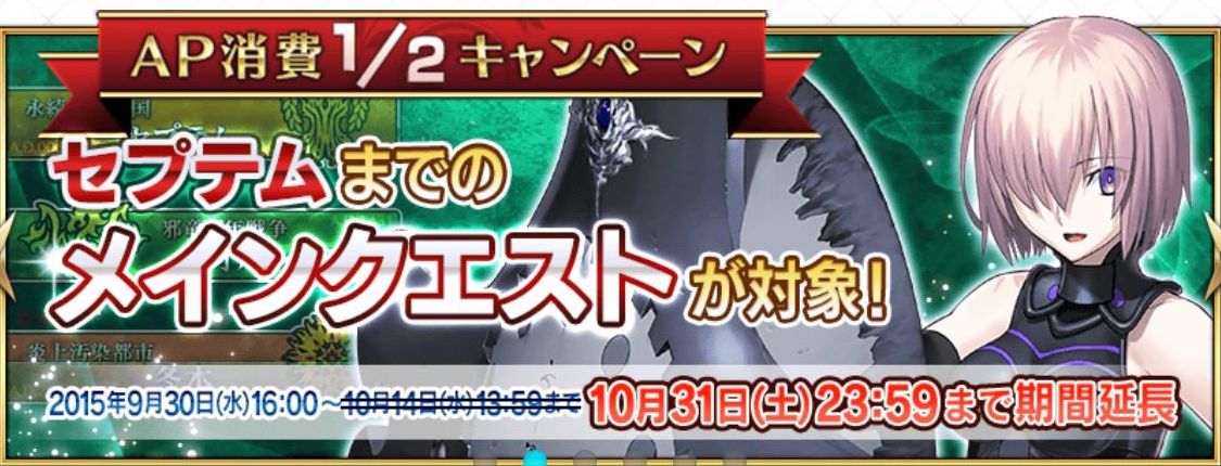 ・メインクエストのAP消費1/2キャンペーンが10月31日(土)23:59まで期間延長