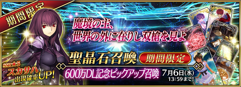 600万DL突破を記念して、「★5(SSR)スカサハ」がピックアップされます。