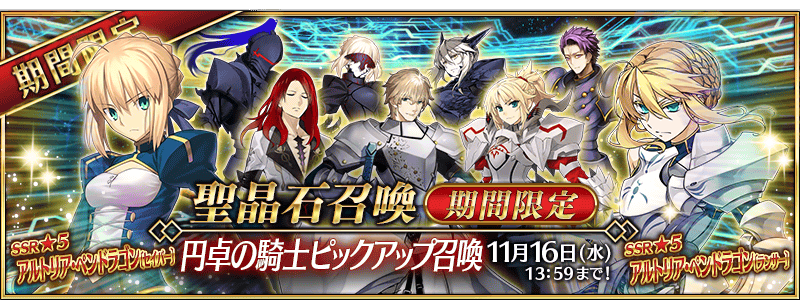 ※ピックアップ期間中、アルトリア・ペンドラゴン〔オルタ〕(セイバー)、アルトリア・ペンドラゴン〔オルタ〕(ランサー)、アルトリア・ペンドラゴン(ランサー)、ガウェイン、トリスタンは章クリア前でも入手可能です。