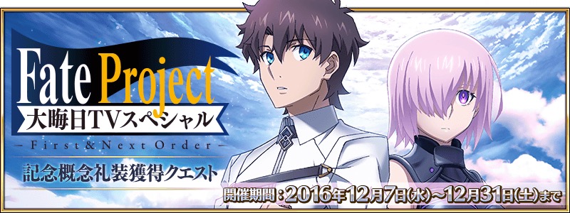 「Fate Project 大晦日TVスペシャル ~First & Next Order~」の放送を記念して、記念概念礼装獲得クエストが実施されます。