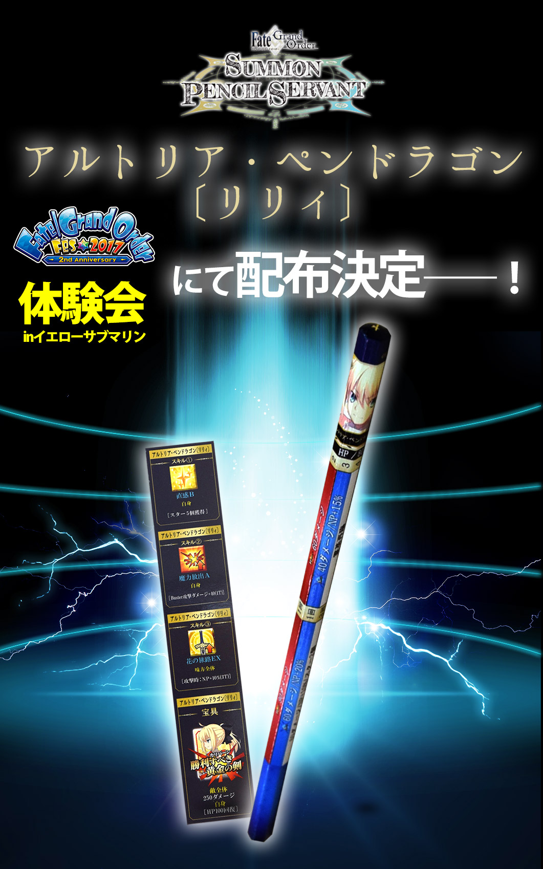 7月29日(土)・30日(日)に開催される「Fate/Grand Order Fes」アニプレックスブース及び「先行体験会inイエローサブマリン」参加者限定で「SUMMON PENCIL SERVANT"アルトリア・ペンドラゴン〔リリィ〕"」の配布が決定しました。