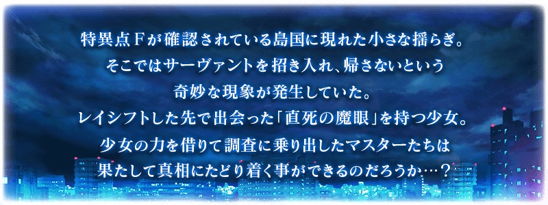 『Fate/Grand Order』にて、2月15日(木)メンテナンス後より、「復刻版:空の境界/the Garden of Order -Revival-」が開催されます。 奈須きのこ原作「空の境界 the Garden of sinners」より、ヒロイン「両儀式」がイベント限定サーヴァント「★4(SR)両儀式〔アサシン〕」として「Fate/Grand Order」の世界に登場! 期間限定で加入する「★4(SR)両儀式〔アサシン〕」と協力し、特異点F付近に現れた揺らぎの謎を解明しましょう。 ※このイベントは、2016年に開催されたコラボレーションイベント「空の境界/the Garden of Order」を、遊びやすく一部を再調整した「復刻版イベント」となります。 「★4(SR)両儀式〔アサシン〕」の性能解説はこちら