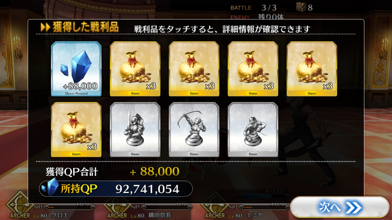 | 3/3 | 女王騎士(弓) HP17,640 | 女王騎士(弓) HP17,640 | トリスタン(弓) HP104,026 |