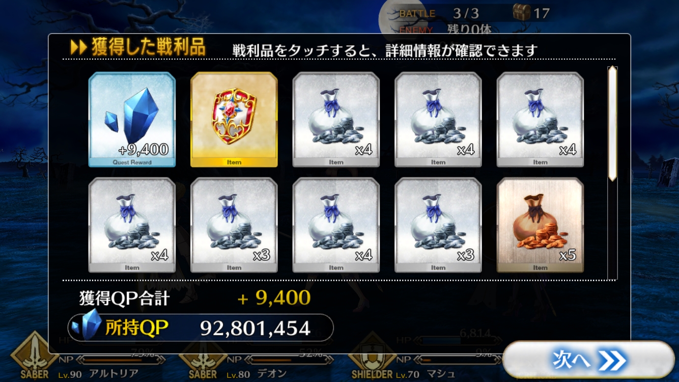 | 3/3 | モードレッド(剣) HP61,305 | 女王騎士(剣) HP13,635 | 女王騎士(剣) HP13,635 |
