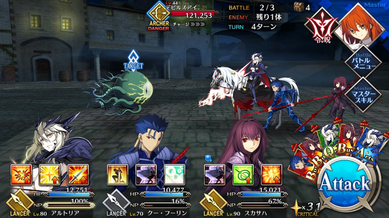 | 3/3 | チャーミングラミア(術) HP26,254 | ヴラド三世(槍) HP253,597 | ビューティラミア(術) HP41,895 |
