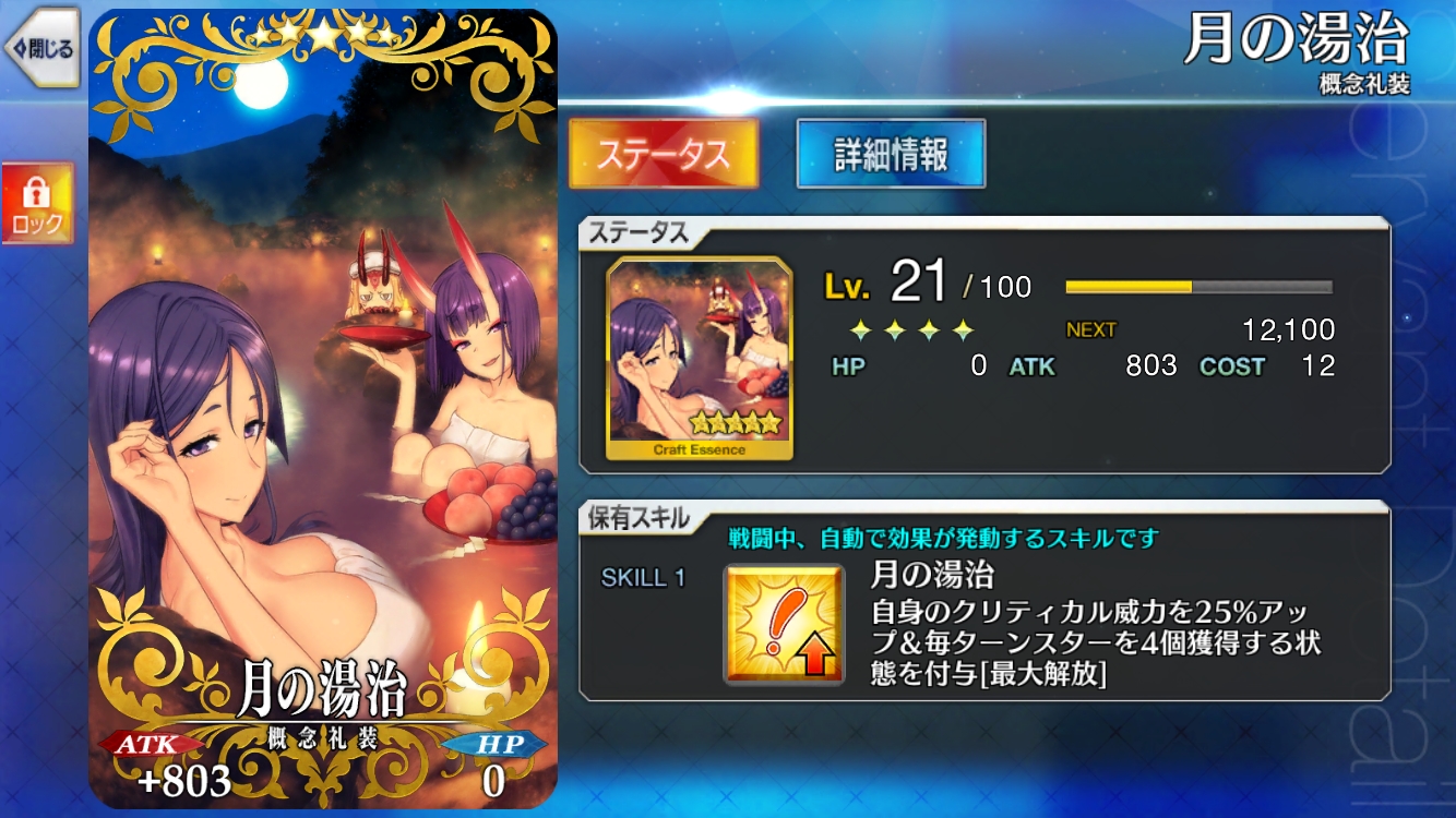 ちなみに、毎ターンスター獲得&クリティカル威力アップの効果を持つ「★5 月の湯治」という礼装もあります。