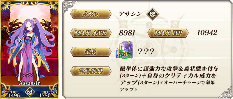 アサシンにありがちな単体Quick宝具で、効果も自身のクリティカル威力アップという非常にアサシンらしいものになっています。クリティカル威力アップの倍率次第では、強力なアタッカーになるでしょう。