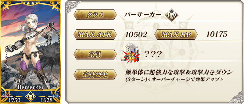 ★4バーサーカーで単体Buster宝具持ちは「ヘラクレス」「ベオウルフ」「茨木童子」と3騎もいるため激戦区。敵の攻撃力ダウンは唯一の効果ですが、HP・ATK共に標準的な数値のため、光るものがないとなかなか使いどころが難しいサーヴァントかもしれません。
