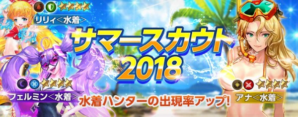 2018年8月15日(水)より開催の期間限定スカウト「サマースカウト2018」では、「アナ」「フェルミン」「リリィ」の3人のハンターが、夏満喫の水着姿となって登場します。