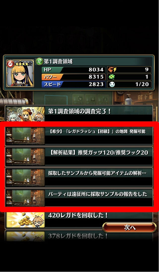パーティのラックが高ければ、レアな報酬を回収できる発掘ポイントを発見できたり、「解析結果」から今後回収できるアイテムが確認できるので、お目当てのアイテムがあるエリアであれば、パーティのステータスを上げて再遠征に出掛けましょう。