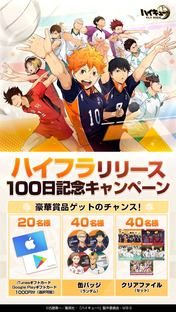 本キャンペーンでは、公式X(旧:Twitter)アカウント(@haikyu_haifura)をフォローし、ハッシュタグ「#ハイフラリリース100日記念」を付け、感想をポストまたは対象ポストの引用RPをすると、抽選で合計100名にギフトカード1,000円分、缶バッジ(ランダム)、クリアファイル(セット)がプレゼントされます。