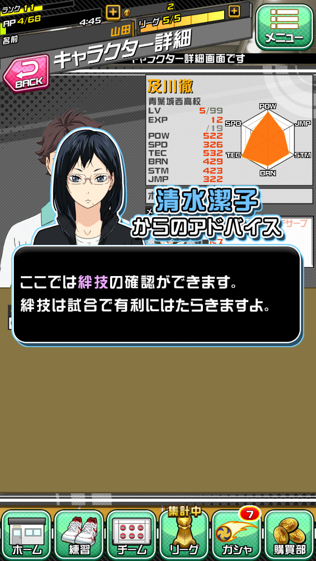 サーブやスパイクなどバレーならではの練習では、経験値を獲得できます。また、同じ練習を行ったキャラクター同士の絆レベルが上昇し、試合で効果を発揮する“絆技”を習得することも!