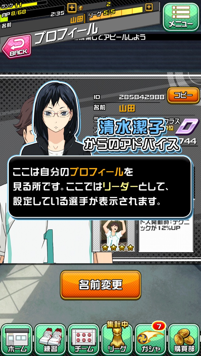 さらに、編成画面でリーダーに選んだキャラクターは、ホーム画面やプロフィールに表示されるようになるので、好きなキャラクターを選択しましょう!