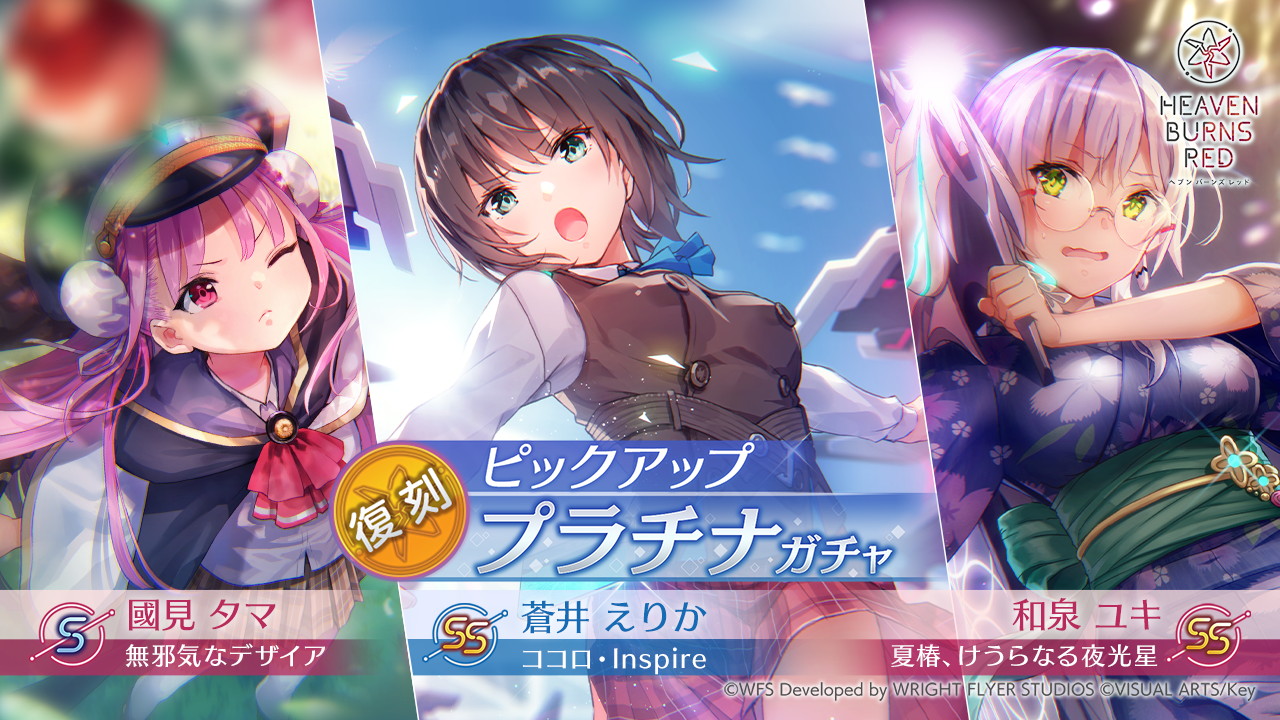 本ガチャでは、「SS[夏椿、けうらなる夜光星]和泉ユキ」「SS[ココロ・Inspire]蒼井えりか」「S[無邪気なデザイア]國見タマ」がピックアップされ、同レアリティの他スタイルよりも提供割合がアップします。