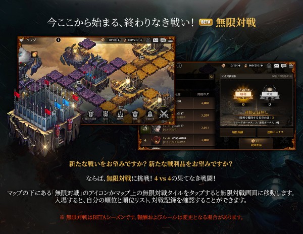今回のアップデートで実装された新コンテンツ「無限対戦」は、4対4で繰り広げられるランダムマッチング戦闘です。