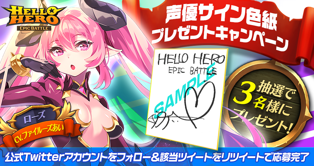 本キャンペーンには、公式Twitterアカウント(@helloheroeb_jp)をフォローし、対象ツイートをリツイートすることで応募ができます。抽選で3名に「ローズ」役のファイルーズあいさんのサイン色紙がプレゼントされます。