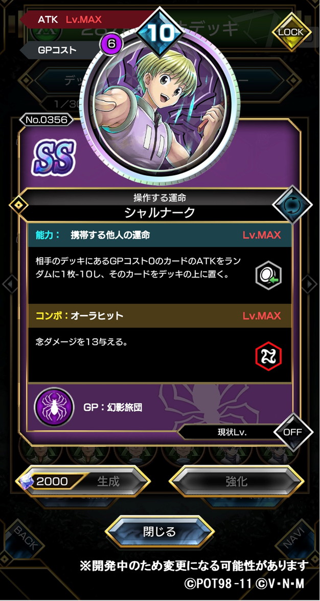 なお、「幻影旅団 SS シャルナーク:操作する運命」は相手のATKを下げて盤⾯に出すことができる能⼒「携帯する他人の運命」をもっており、「幻影旅団」らしい能⼒で相手をけん制することができます。