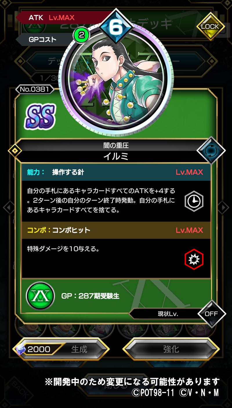 なお、SSキャラカードとしては初登場の「イルミ」のカードは、自分の手札にあるすべてのキャラカードのATKをプラスする能⼒「操作する針」、同じくSSキャラカードとしては初登場の「フィンクス」のカードは、相手が特定の条件のキャラカードを配置したときに自分のGPに応じた念ダメージを与える能力「未知数の剛腕」をもっています。