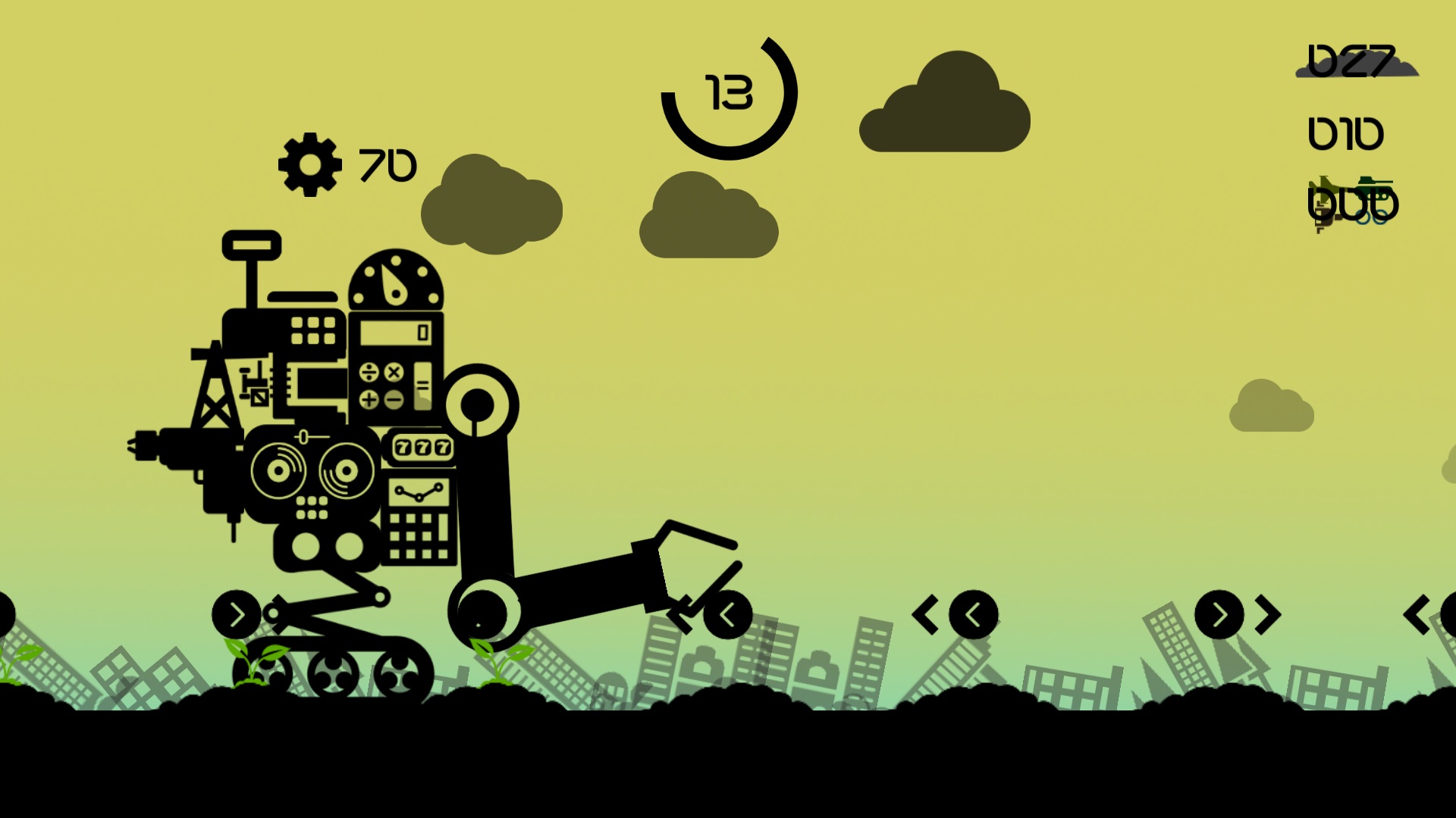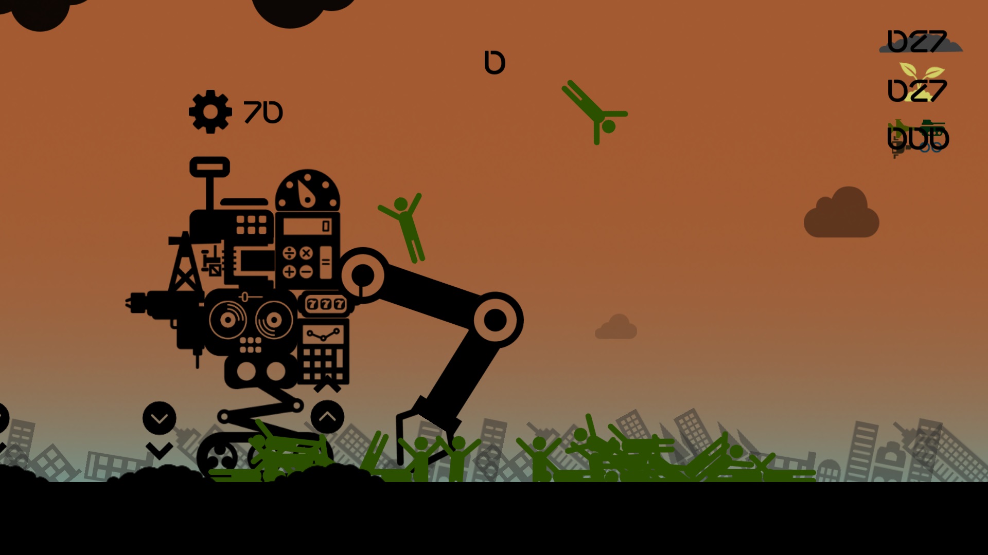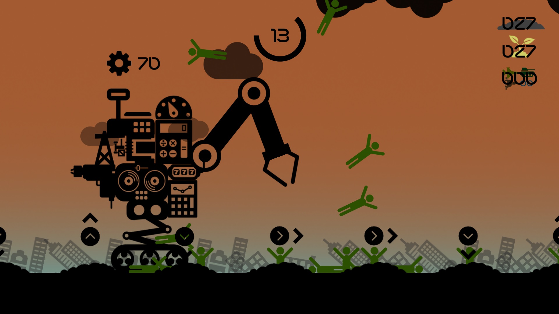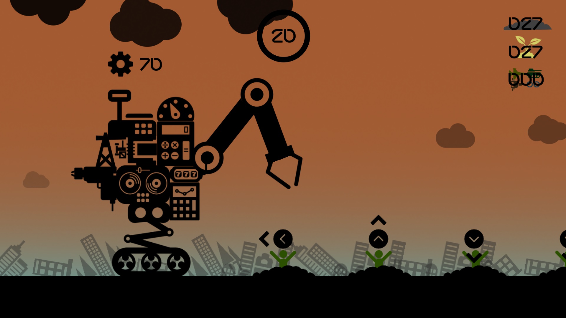 こちらが本作のプレイ画面です。プレイヤーが行うことは、この大きな謎の機械を使って、土を耕す、苗木を植える、ひとを収穫する、の3ステップ。