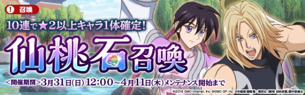期間中、新たなキャラ「★3【殷の将軍】聞仲(CV:前野智昭)」と、「★3【殷の将軍】朱氏(CV:名塚佳織)」が登場する「仙桃石召喚」が開催予定です。