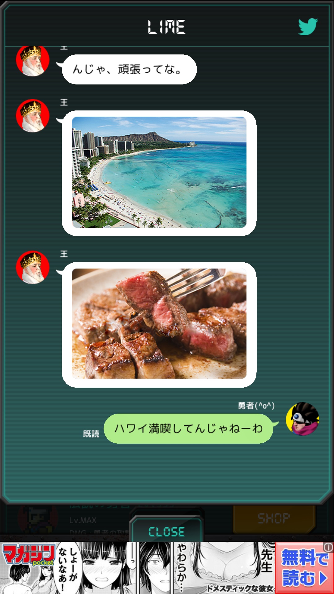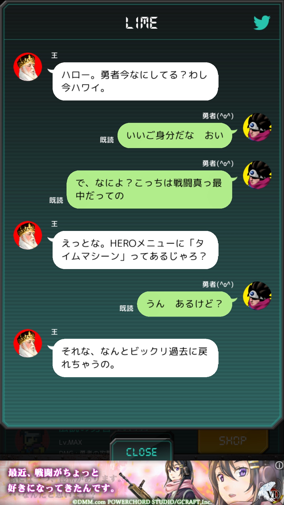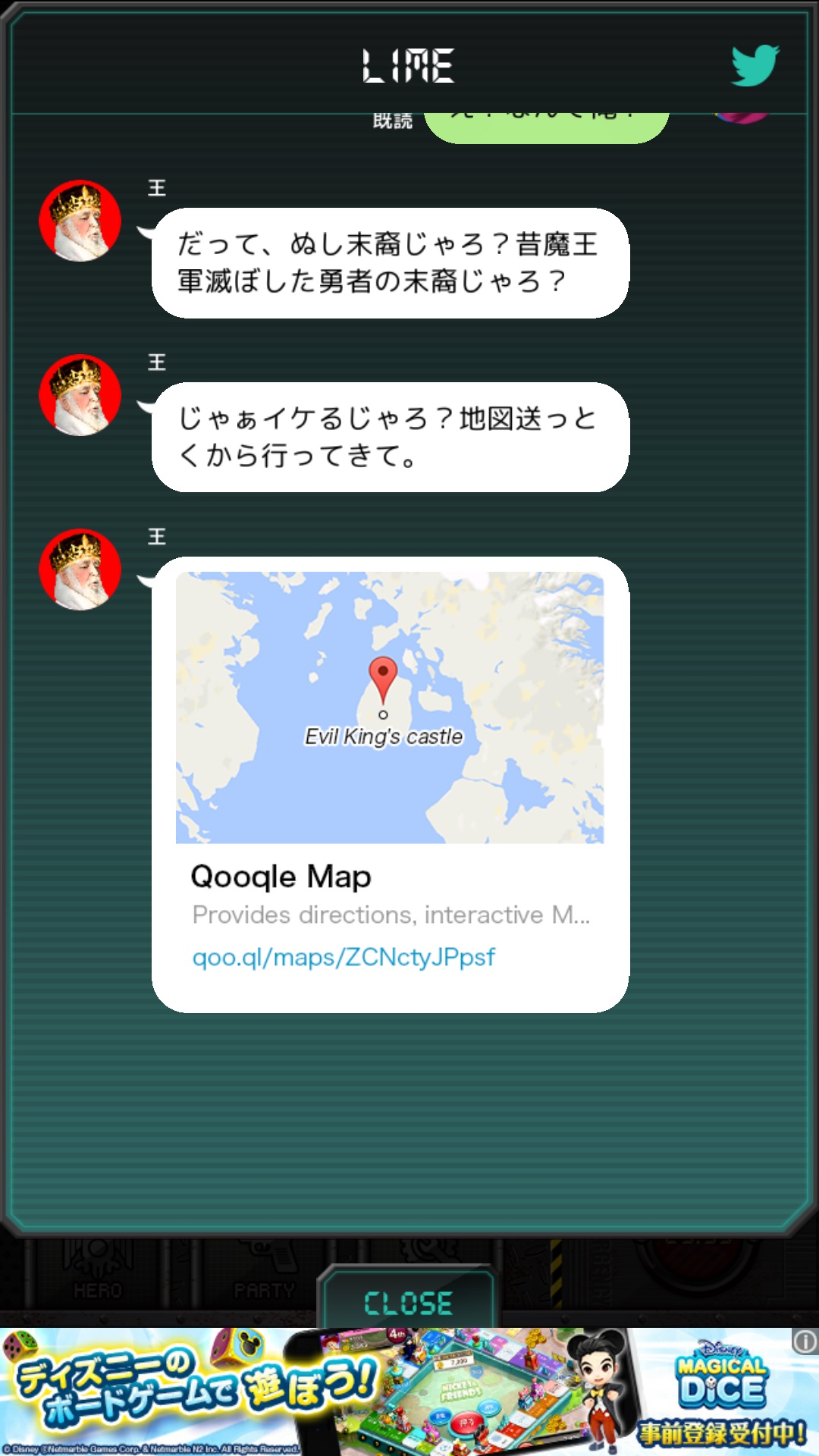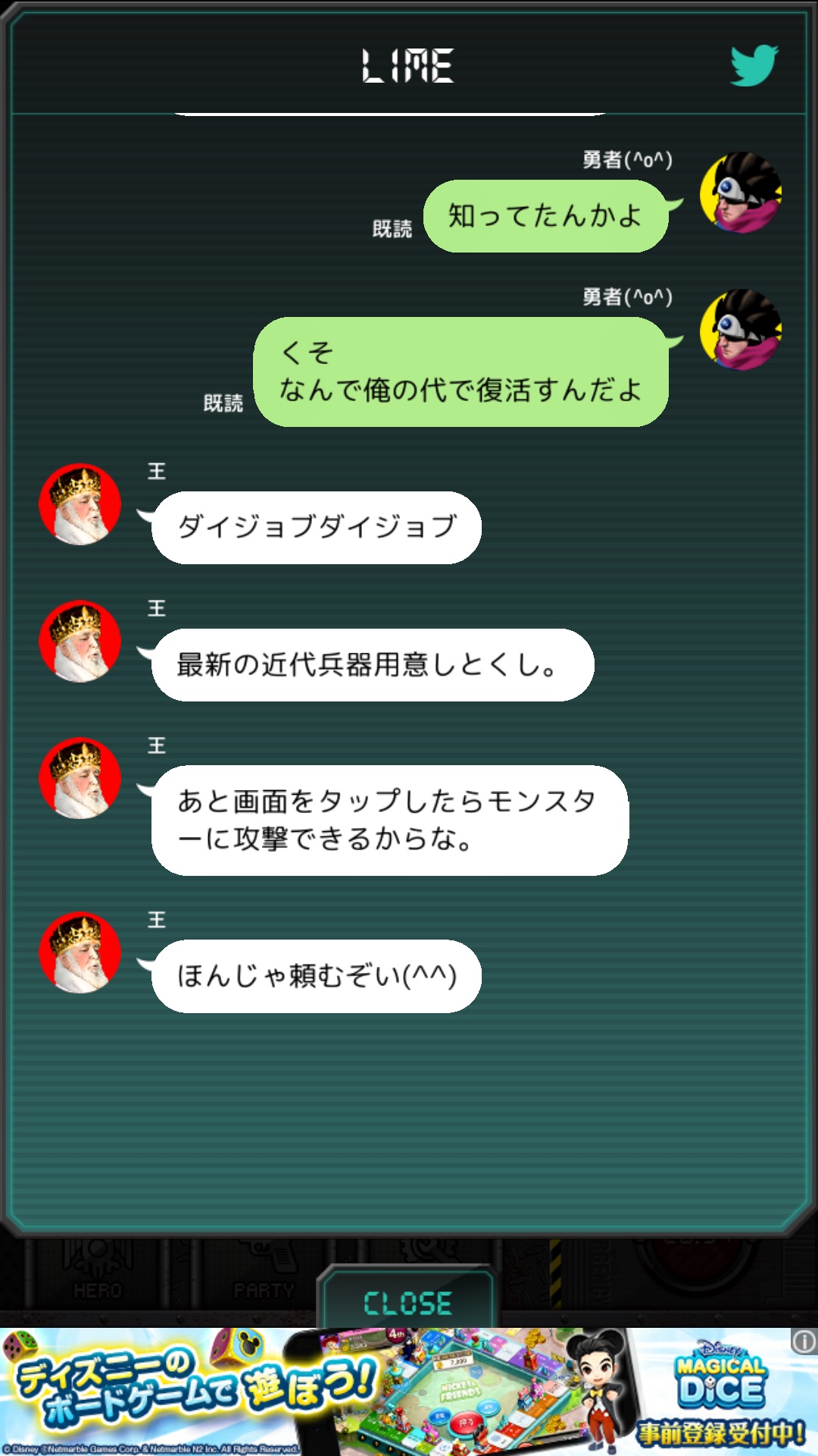 それに対して王様は、魔王が復活したことに気付き、勇者の末裔に魔王討伐を指示します。その指示の出し方がLIMEという、どこかで見たことあるような現代社会のコミュニケーションツールなのも面白いですね。
