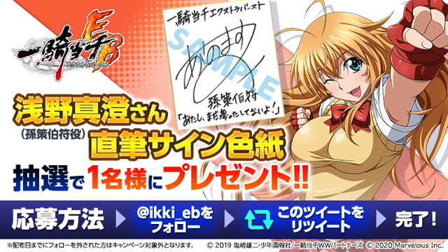 本キャンペーンでは、公式Twitterアカウント(@ikki_eb)をフォローし、対象ツイートをリツイートすると、抽選で1名に「孫策伯符」を演じている浅野真澄さんの直筆サイン色紙が当たります。