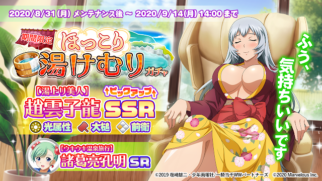 『一騎当千エクストラバースト(えくばと)』にて、本日2020年8月31日(月)メンテナンス後より、「ほっこり湯けむりガチャVol.1」が開催されました。