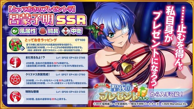 ※「【とっておきのプレゼント】呂蒙子明」は、「クリスマスコイン2020」と「【クリスマス】銀のアイテムガチャ券」の獲得数50%アップと、イベントボス「ホワイトカリブー」への与ダメージ50%アップの特効効果を発揮します。