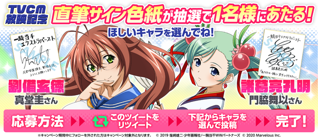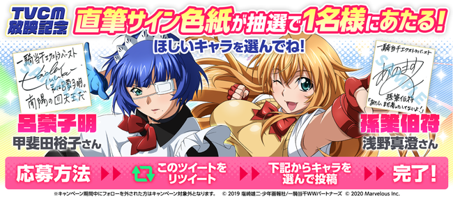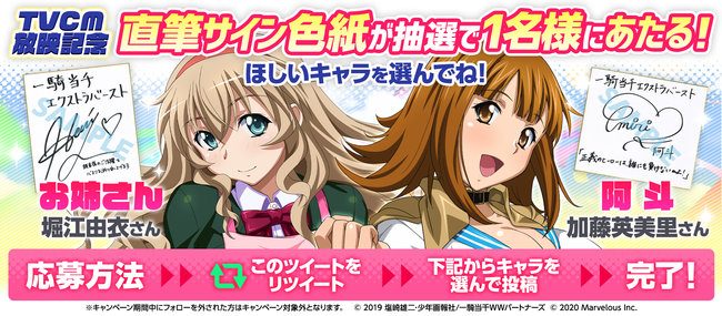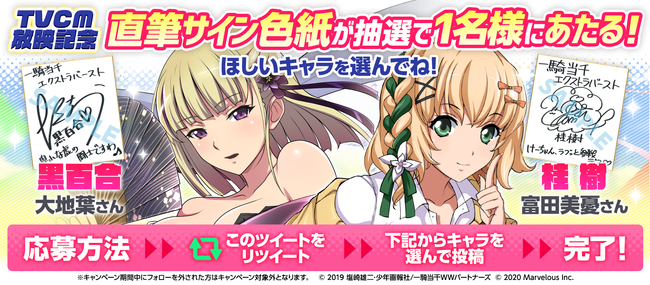 本キャンペーンでは、公式Twitterアカウント(@ikki_eb)をフォローし、対象ツイートをRTすると、抽選で各1名に出演声優の直筆サイン色紙が当たります。