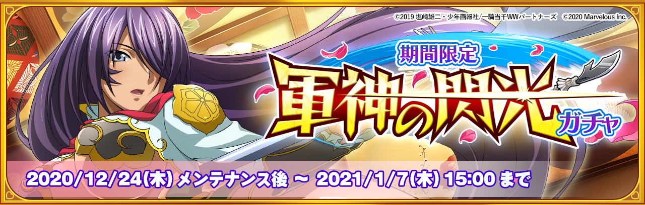 『一騎当千エクストラバースト(えくばと)』にて、本日2020年12月24日(木)メンテナンス後より、SSR闘士の排出率が龍玉ガチャの1.5倍のバーストフェス「軍神の閃光ガチャ」が開催されました。