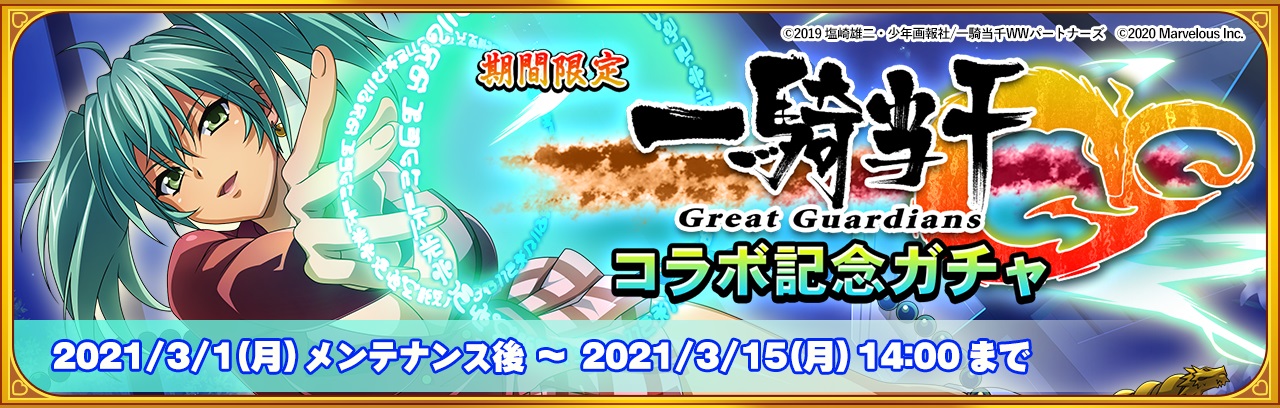本日3月1日(月)メンテナンス後より、「一騎当千Great Guardiansコラボ記念ガチャ」が開催中です。