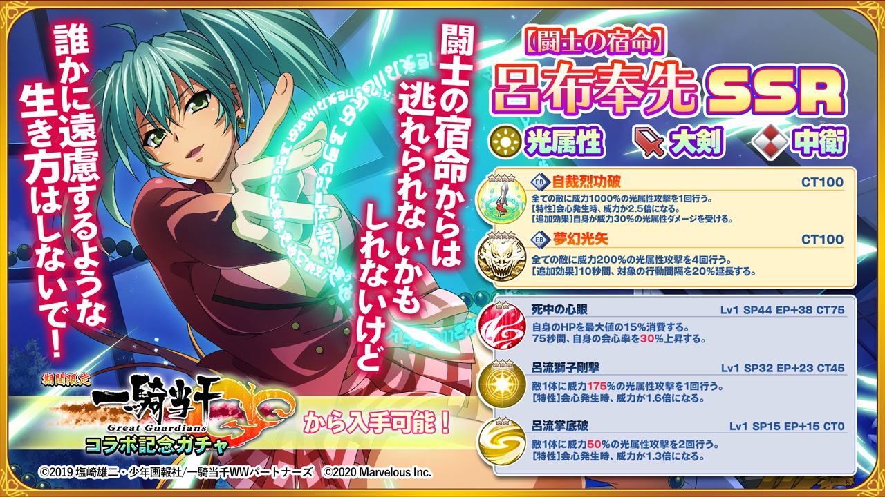 なお、「【闘士の宿命】呂布奉先」をイベント「Great Guardians〜彼を知り己を知れば百戦殆うからず〜」でパーティに編成すると、イベントアイテムの獲得数アップと、イベントボスへのダメージアップの特効効果を発揮します。