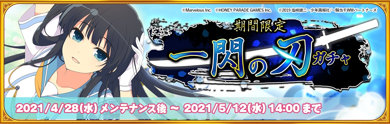 本日4月28日(水)メンテナンス後より、「一閃の刃ガチャVol.1」が開催中です。