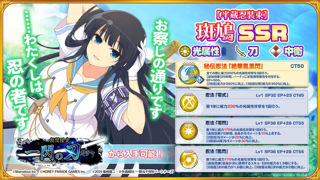 なお、イベント「シノビ遭遇!咲き誇れ、閃乱の闘士」で「【半蔵忍装束】斑鳩」をパーティに編成すると、イベントアイテムの獲得数アップや、イベントボスへのダメージアップの特効効果を発揮します。
