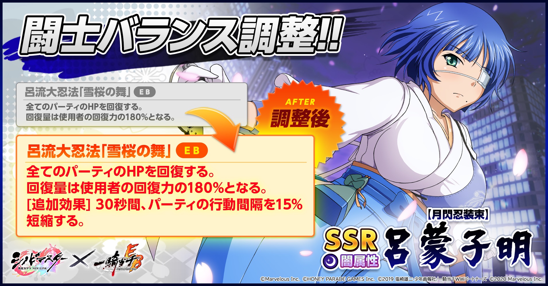 また、「【月閃忍装束】呂蒙子明」のバランス調整が行われ、呂流大忍法「雪桜の舞」に効果が追加されています。